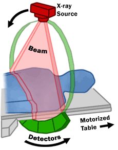 In practice, the scanner does not reconstruct the whole 3D volume at once. Instead, it scans the patient slice by slice along the body axis. For each fixed position of the table: